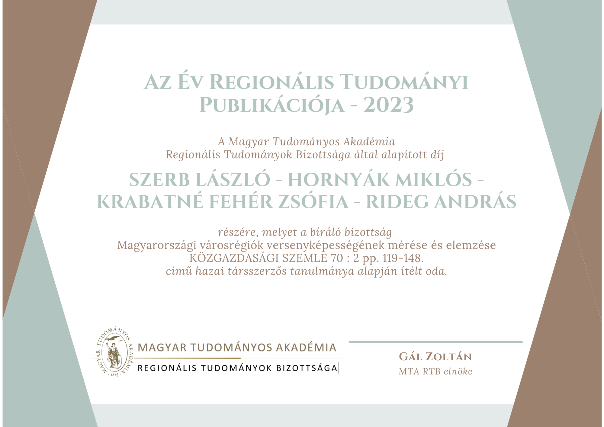 Felhívás „Év Regionális Tudományi Publikációja” díjra. Pályázat határideje: 2024. december 15.