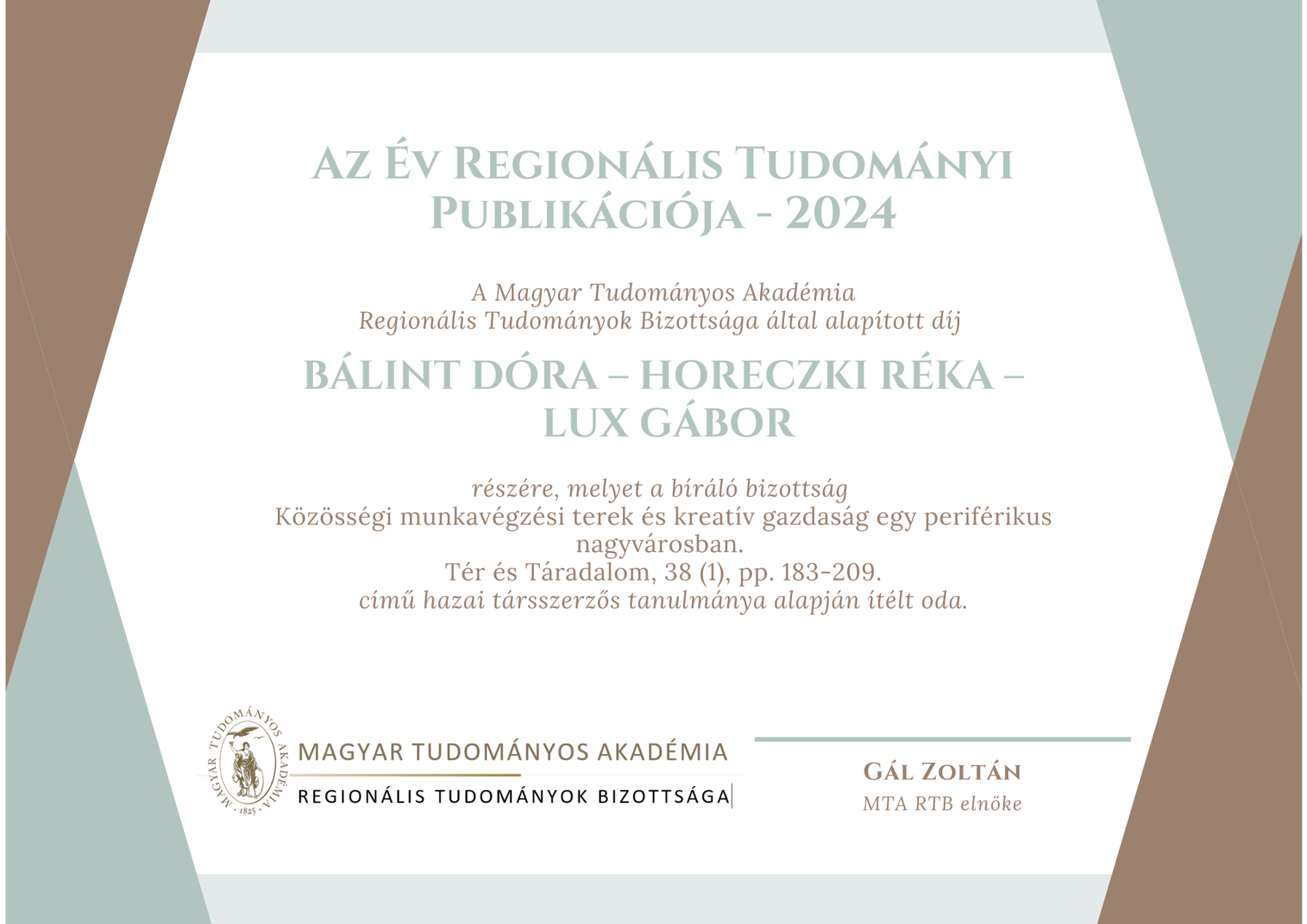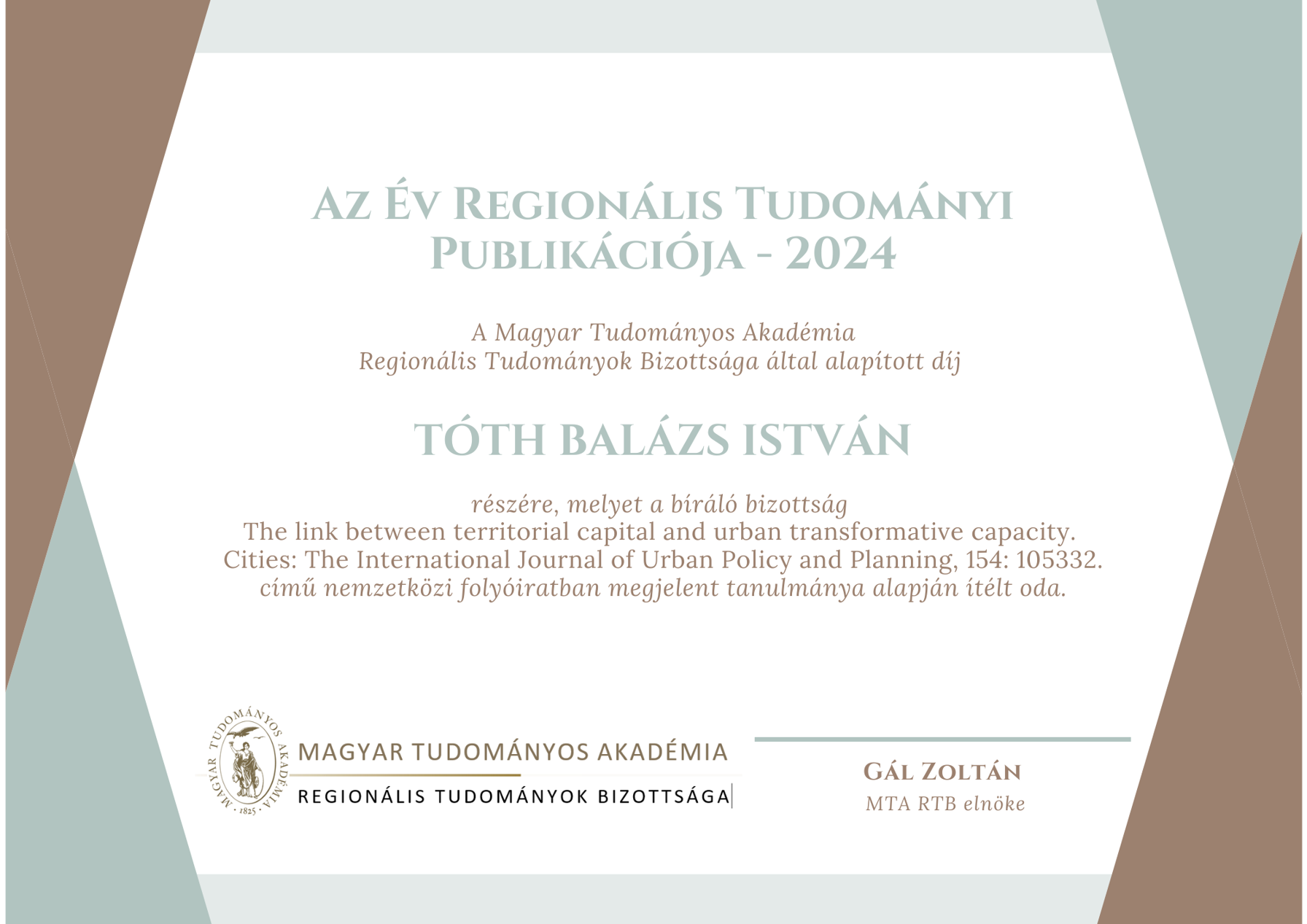 Az MRTT 2024. évi vándorgyűlésén került átadásra az "Év Regionális Tudományi Publikációja" díj.